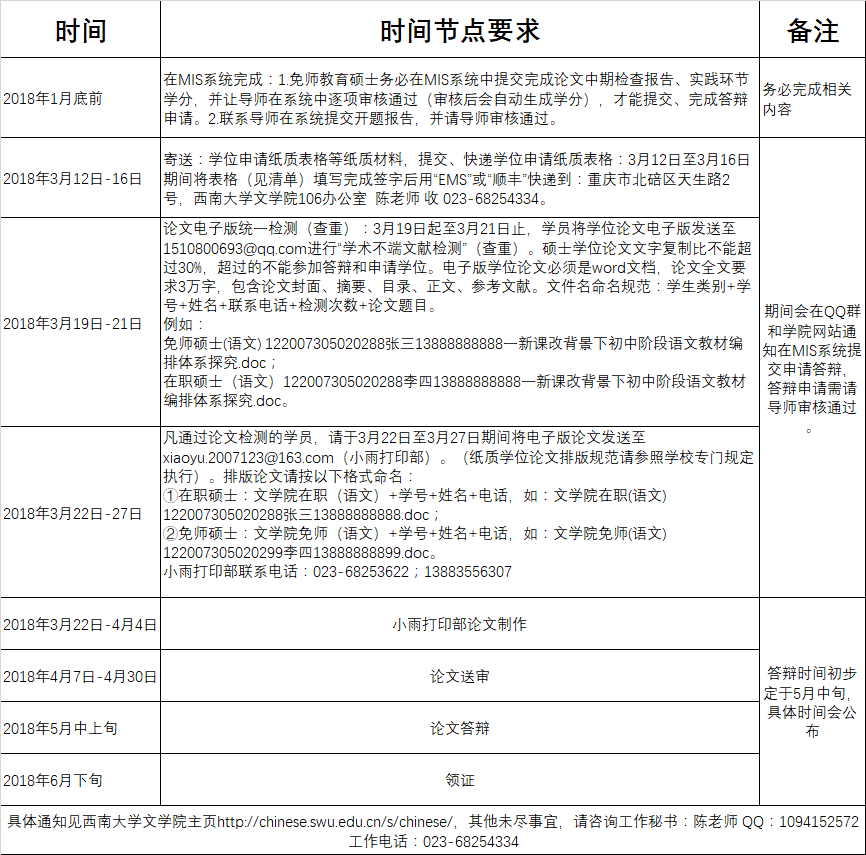 1、论文答辩:学院初步拟于5月中旬进行学位论文答辩,具体时间将在4月中旬通知,请及时关注西南大学best365英国在线体育官网主页和QQ群信息。