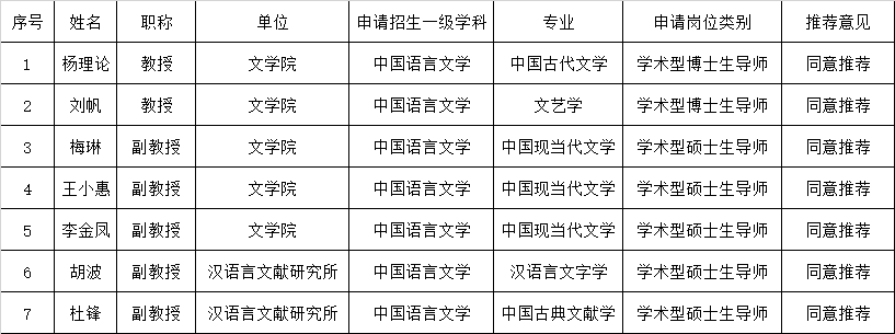 依据《西南大学学术型研究生指导教师岗位审核管理办法》(西校〔2016〕424号)、《西南大学加强研究生导师立德树人职责的实施办法》(西委〔2018〕73号)和研究生院《关于开展2019年首次申请学术型研究生指导教师岗位审核工作的通知》要求,中国语言文学学术委员会于11月8日召开学术委员会会议,根据申请人在该学科领域的学术成果、学术水平、科学研究能力等相关申请材料,进行综合评议,现将审核结果公示如下: