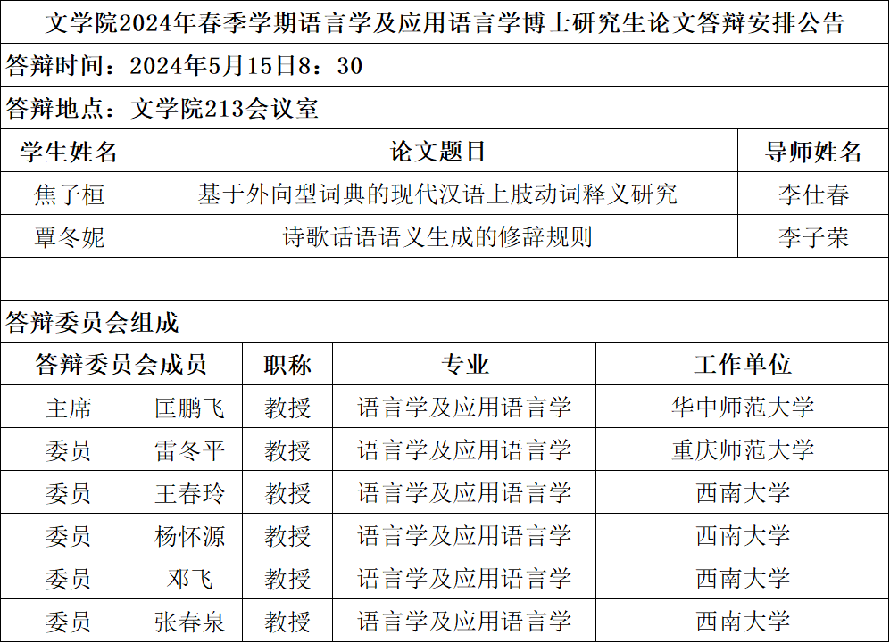best365英国在线体育官网2024年春季学期语言学及应用语言学专业博士学位论文答辩安排公告