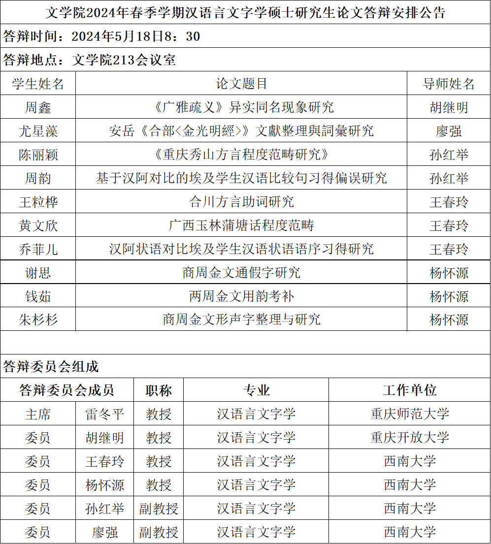 best365英国在线体育官网2024年春季学期汉语言文字学专业硕士学位论文答辩安排公告