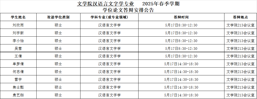 best365英国在线体育官网汉语言文字学专业2025年春季学期学位论文答辩安排公告
