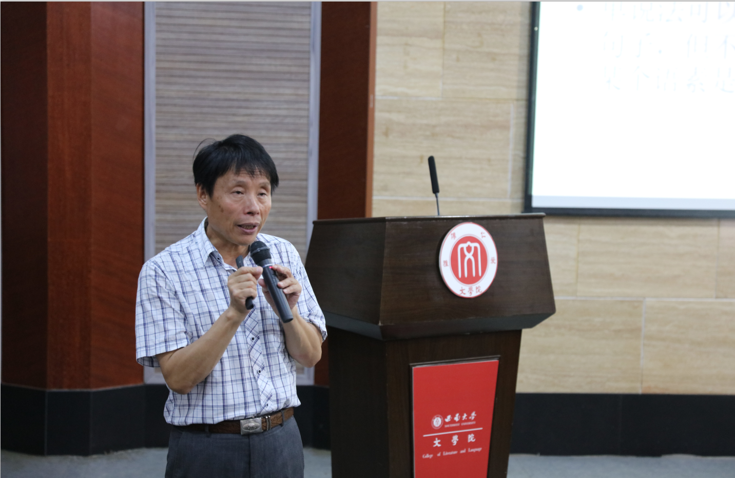 陈保亚教授围绕“词本位与字本位之争”“时间中的词汇化、认知语法、深度学习带来的方法论转变”“语言复杂系统”等主题进行讲授。陈保亚教授认为,语言作为复杂系统,最主要的表现为有规则的泛时系统,即语言在历时演化过程中仍然具有共时规则。词作为最小的自由形式,并不能体现出泛时系统的规则。语言在历时地使用过程中,自由形式和黏着形式经常相互转换,但黏着语素很多都保留着规则。陈保亚教授指出,语言习得的一个基础是建立规则及其规则单位,规则活动的最小语法单位可以称为语符。语符的存在,使规则的还原在语言复杂系统的演变过程中得以实现。