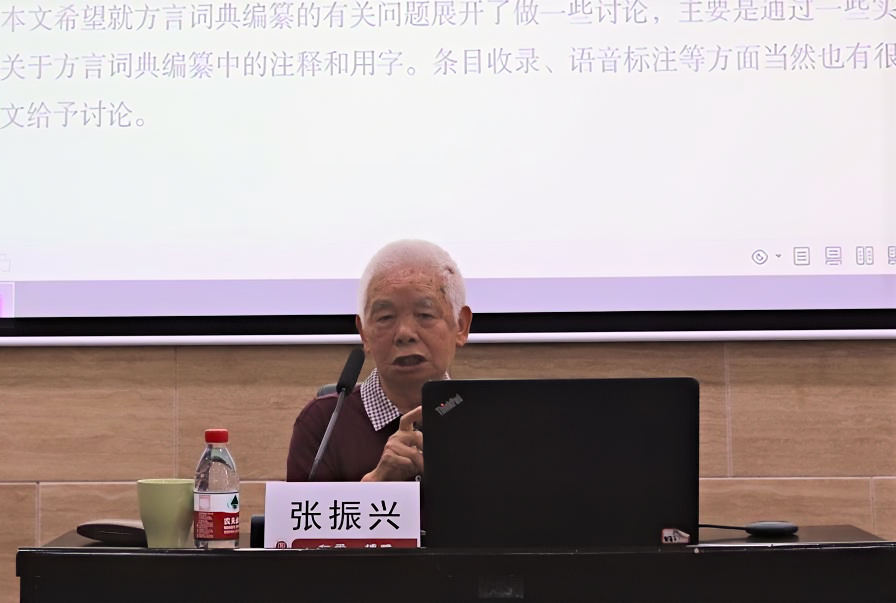 张振兴教授从方言词典的注释和方言词典的用字两个方面阐释了该如何处理方言词典编纂工作中的难题,认为方言词典中反映方言地区语言文化特点的条目,看似简单常见却难以注释。他以“沙船”“烧鸡庐屋儿”等方言条目为例,表示方言词典中方言条目的注释应该具有浅显易懂、书证详实、文化背景明晰三个特点。张振兴教授指出,方言词典在编纂时必须收录“猪”“虎”等十分常见的方言条目,可在参考《现代汉语词典》释义的基础上适当改动。针对方言词典的用字,张振兴教授认为在许多方言中繁简体字分别代表不同意义,方言词典用字的总原则为:合理使用方言本字;适当使用方言字;文从主人,也要从众从俗,合理使用俗字、训读字、同音字、表音字,甚至直接使用音读。张振兴教授表示,无论是方言词典的编纂,还是学术研究,都应该做到将复杂问题简单化,要先摆事实再讲道理。