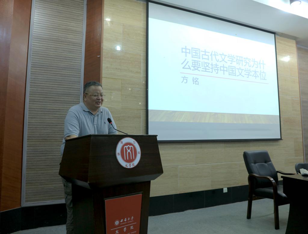 讲座伊始,方铭教授从自己对战国文学研究的思考出发,引出近代前的中国文学独立发展有其自身的规律,强调中国文学本位立场应从中国文学自身理论体系出发,对其进行本位化研究。方铭教授指出,文学是中国固有的学科,最早出现在《论语·先进》中,至战国秦汉后更成为专门的职业,直至清末中国文学都是以独立体系发展的。
