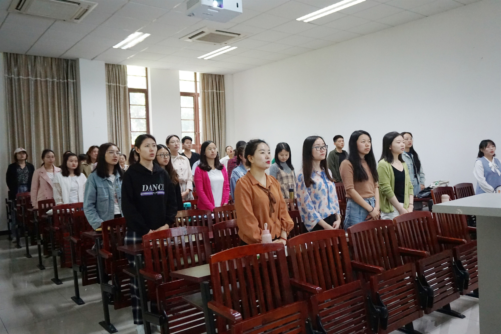 随后,全体同学共同观看了《党史故事100讲——五四运动,唤醒民众》视频,回顾五四运动的历史,重温五四爱国精神。100年前的五四运动,爆发于民族危难之际,是一场以先进青年知识分子为先锋、广大人民群众参加的彻底反帝反封建的伟大爱国革命运动,以磅礴之力鼓动了中国人民和中华民族实现民族复兴的志向和信心。在“知识问答”环节,“视频+问答“的方式激起了同学们的学习兴趣,也巩固加深了同学们对“五四”的记忆。最后,在研会刘丽莎同学的带领下,全体同学重温入团誓词,在宣誓中感知五四的精神与使命。