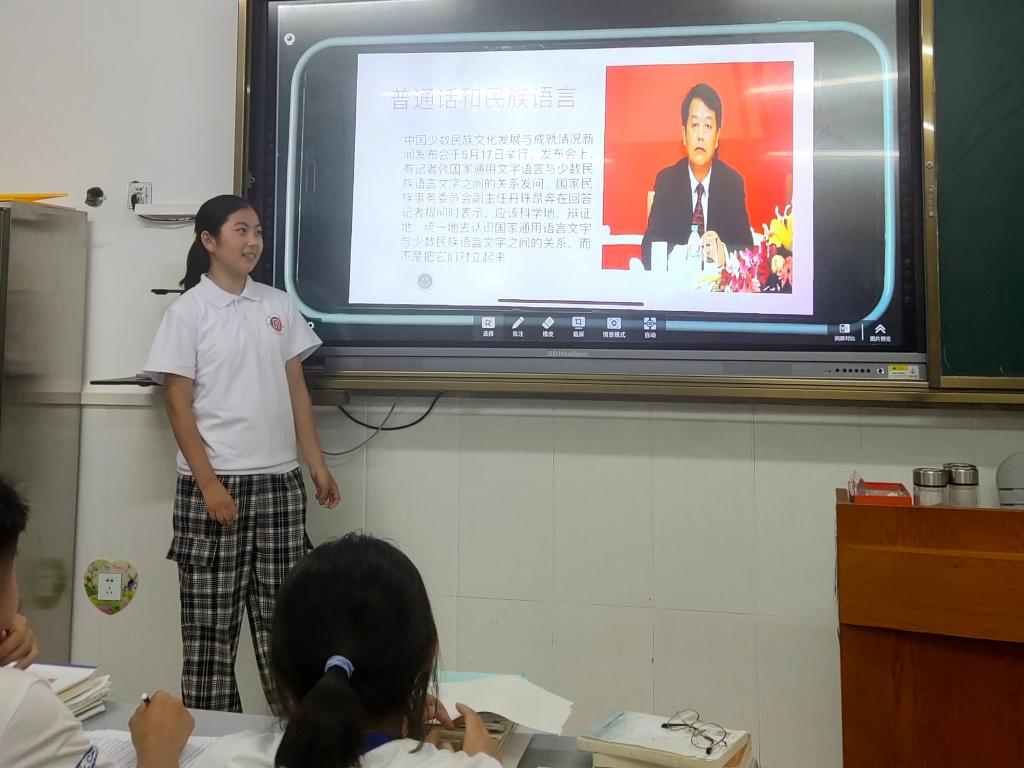 此外,小分队走进内蒙古兴安盟科尔沁右翼前旗第一中学,深入学生课堂,开展了推广国家通用语言课堂。小分队从国家通用语言的定义、国家通用语言与民族语言的关系和维护民族团结的重要性三个角度,向同学们分享了国家通用语言的相关知识,在学生的心中撒下了要努力学习并推广国家通用语言的种子。