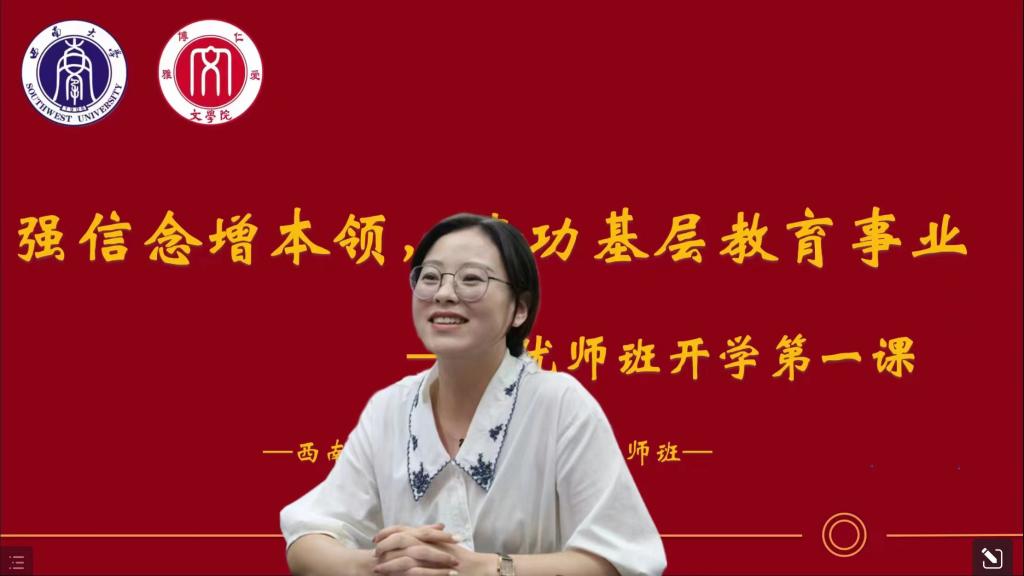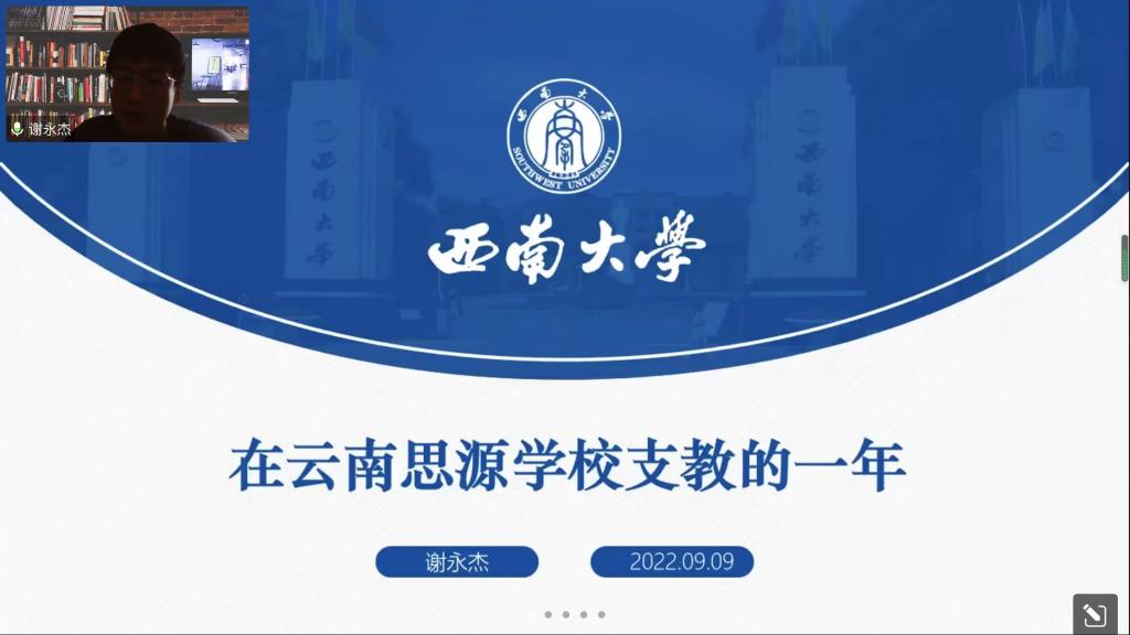 9月9日下午,best365英国在线体育官网举行2022级优师班开学第一课。西南大学研究生支教团云南昌宁分队队长谢永杰、西南大学研究生支教团西藏昌都分队成员胡晋歌受邀参加,best365英国在线体育官网2022级辅导员唐利平和优师班全体新生线上参与。