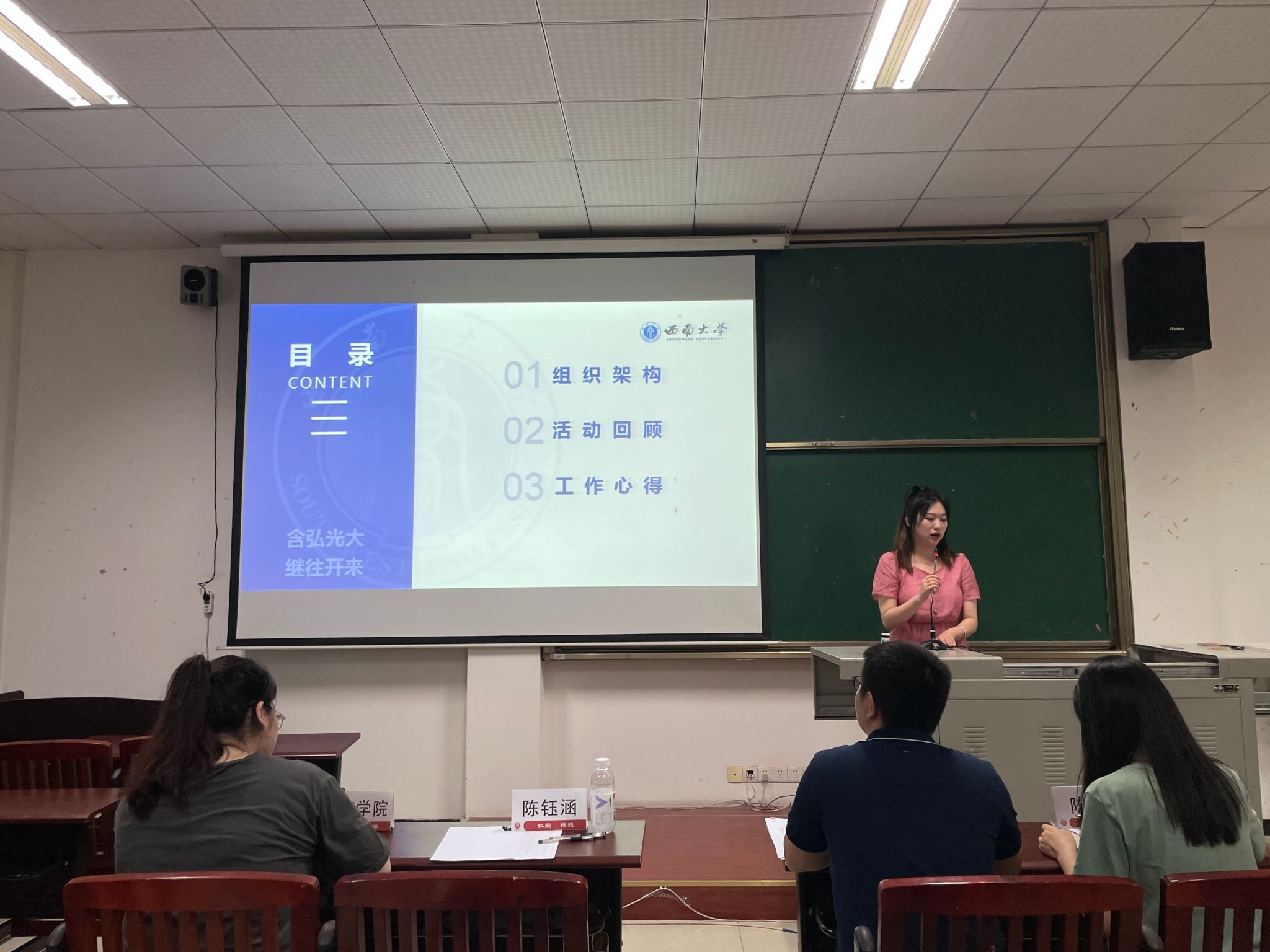 主席团成员陈钰涵介绍了best365英国在线体育官网研究生会的组织架构,明确了主席团及各部门的职责。通过回顾春季学期重要板块,从思想政治建设、学术科研建设、就业服务与社会实践建设、文艺体育建设及宣传平台建设五个方面对本学期的工作进行了总结,从中吸取经验、补足缺点,为下学期工作的开展奠定了坚实的基础。