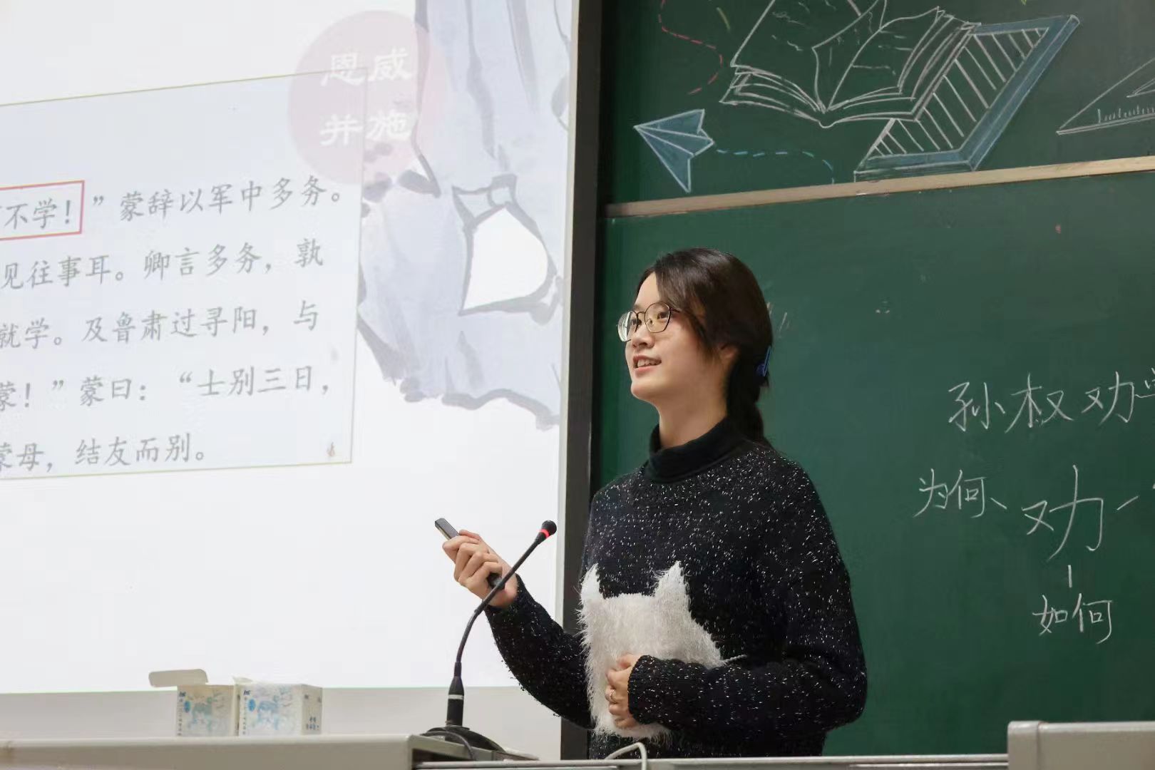 本次比赛中,各位参赛选手依次上场进行10分钟的模拟课堂教学。教学内容涉及诗词、古文、新闻评论、散文等,选手们展现了扎实的专业知识储备和良好的教学风采。随后,王浩老师、包凯俐老师从教学内容、教学方法、课堂表现等方面对选手们的课堂教学进行了评价,并给选手们提出了宝贵建议:一是在文本细读的基础上设置合理、明确的教学目标,二是立足学情制定适合的教学路径,三是选择聚焦性的提问方式,帮助学生理清思路。