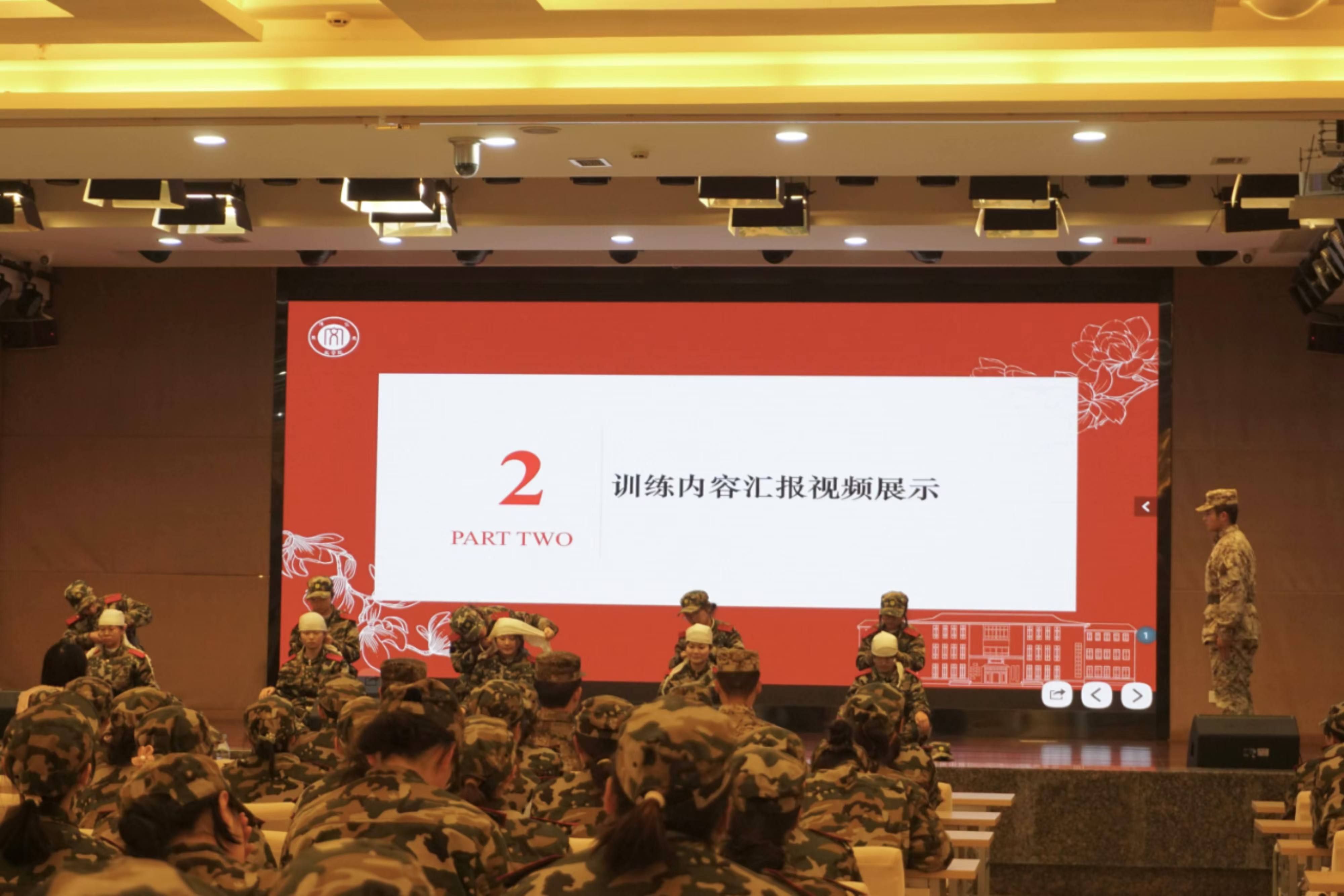 大会以国歌齐唱开场,随后播放了一段训练视频,展示了学生们在军事训练中的成长历程,包括日常训练、团队协作、战术演练等多个方面。视频结束后,学员代表进行了头部和肩部包扎的现场演练,赢得了在场师生的热烈掌声。