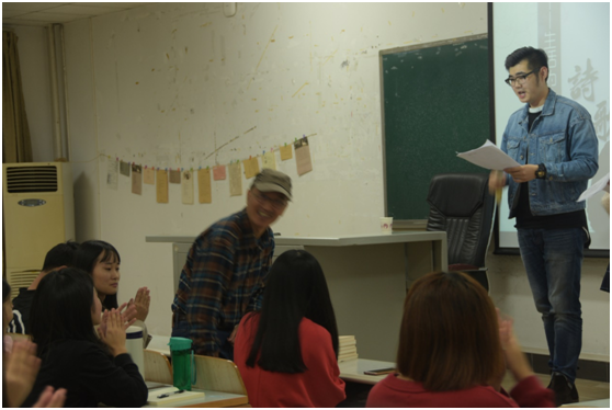 第五位同学放眼时代,就时代发展下诞生的自媒体对诗歌的冲击,并就自己利用网络阅读诗歌的方式,向老师提问。老师回答,各种各样的阅读形式都是可取的,不用在意别人的眼光,只要你是真正地在阅读了,阅读的本质并没有变化,你收获到的也不会因为形式的改变而有所贬值。