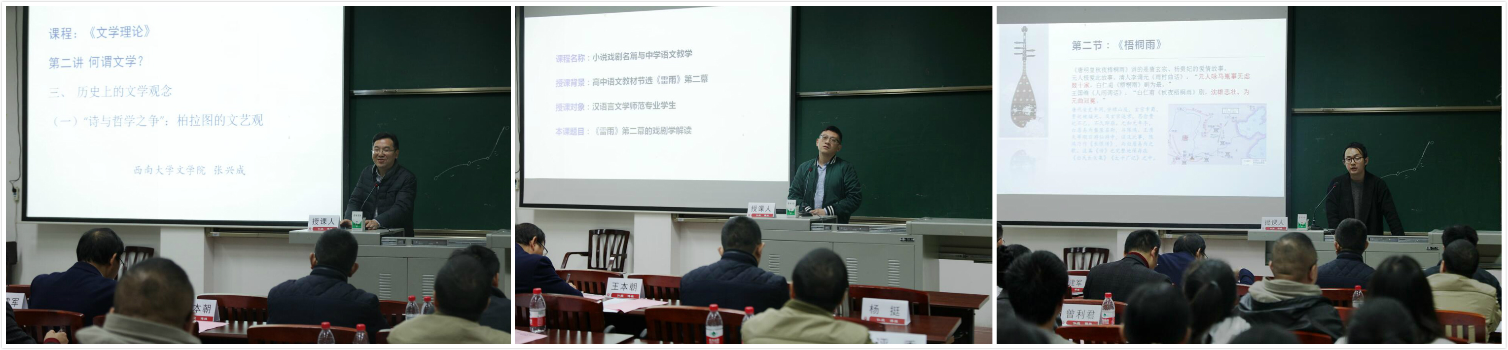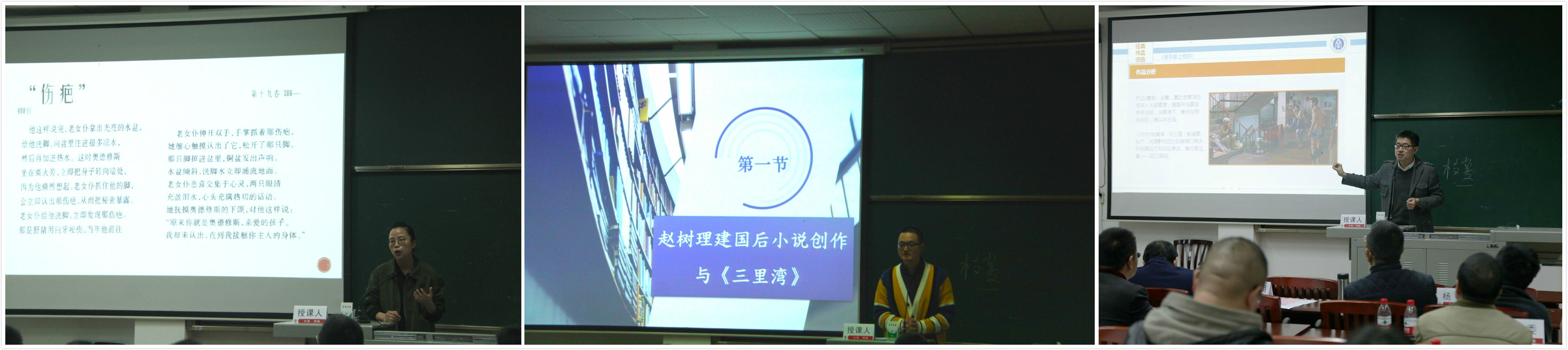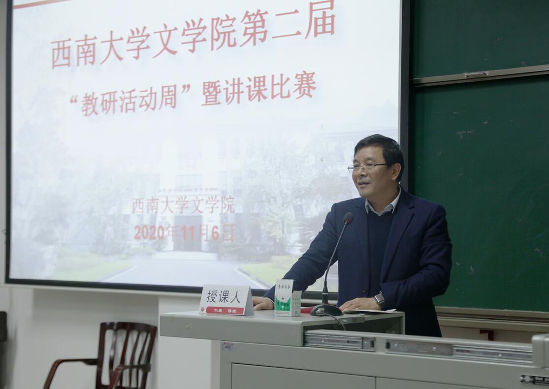 参赛教师以“新文科,从我的课堂开始”为主题,根据本学期教学情况自定讲课内容,在讲课中扎根对作品本身的探寻,融入自己的研究成果,深入解读教学内容。刘叙武老师从亚里士多德戏剧提示为出发点,深入剖析了戏剧《雷雨》第二幕。张兴成老师以柏拉图的文艺观为切入点,探讨作品《柏拉图:诗人与哲学家之争》,见微知著呈现历史上的文学观念。付佳奥老师讲授白朴的杂剧和歌曲,解读悲伤凄凉的《梧桐雨》。毛志萍老师以视频中汉语拼音的读音是否标准为探讨,讲授生动有趣的汉语拼音方案读音课。姜永琢老师从思维、存在、表达三个维度出发,分析阐述西方美学思想。郑邦宏老师讲授说文部首形体演变一课,将晦涩的理论转换为有趣的语言。邝明艳老师解读了史诗巨匠荷马的作品,探究了奥德修斯伤疤的背后文学魅力。马泰祥老师深入剖析了赵树理建国后小说创作。许若谷老师从《谁先爱上他的》剧作的几个关键问题入手,解密影视剧作中“色彩——镜头”等创作技巧。讲课结束后,评委曾利君教授、刘帆教授从教学内容、教学语言、教学态度、教学组织和教学特色等方面进行点评与打分。最终,毛志萍老师被推选出参加学校讲课比赛。