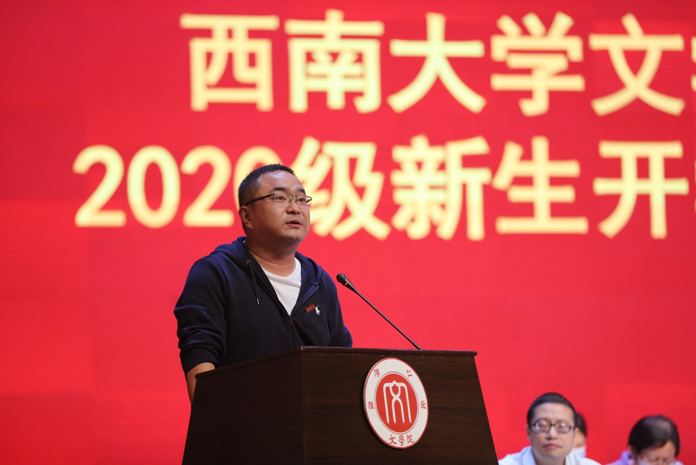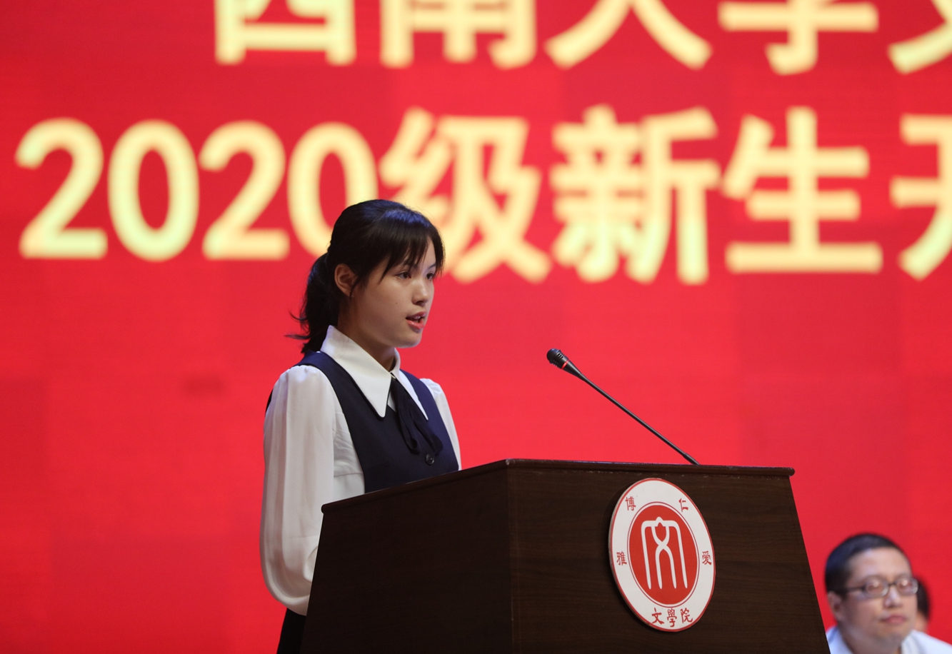 在读学生代表2018级硕士研究生蒋裕涵同学介绍了自己在西南大学的求学经历,分享了她对学校、学院悠久历史和人文情怀的理解。蒋裕涵同学表示,我们应该在学校和学院精神的滋养中弘文励教,守正出新,做幸福的追梦人;高效利用时间,升值大学生活;真诚待人,做人格健全、诚信坦荡、仁爱社会的文学青年。
