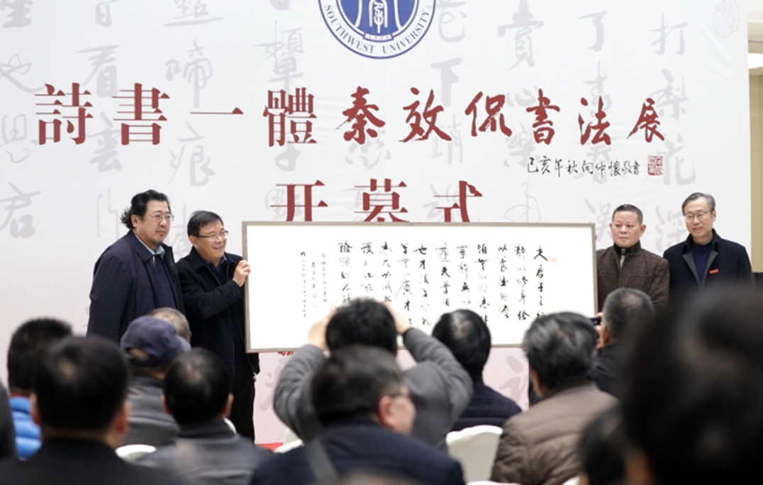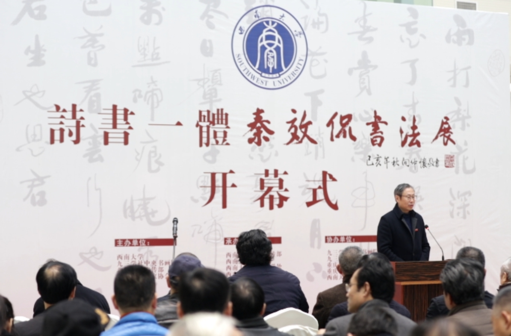 12月5日,由西南大学、九三学社中央书画院、北碚区委宣传部、重庆市书法家协会主办,西南大学党委宣传部、best365英国在线体育官网、社会科学处、出版社、博物馆承办,九三学社重庆书画院、九三学社重庆市北碚区委、重庆缙云书画院、重庆市北碚区书法家协会、best365英国在线体育官网中国书法研究所协办的“秦效侃书法作品展暨西南大学第四届书法论坛”在学校博物馆举行开幕仪式。