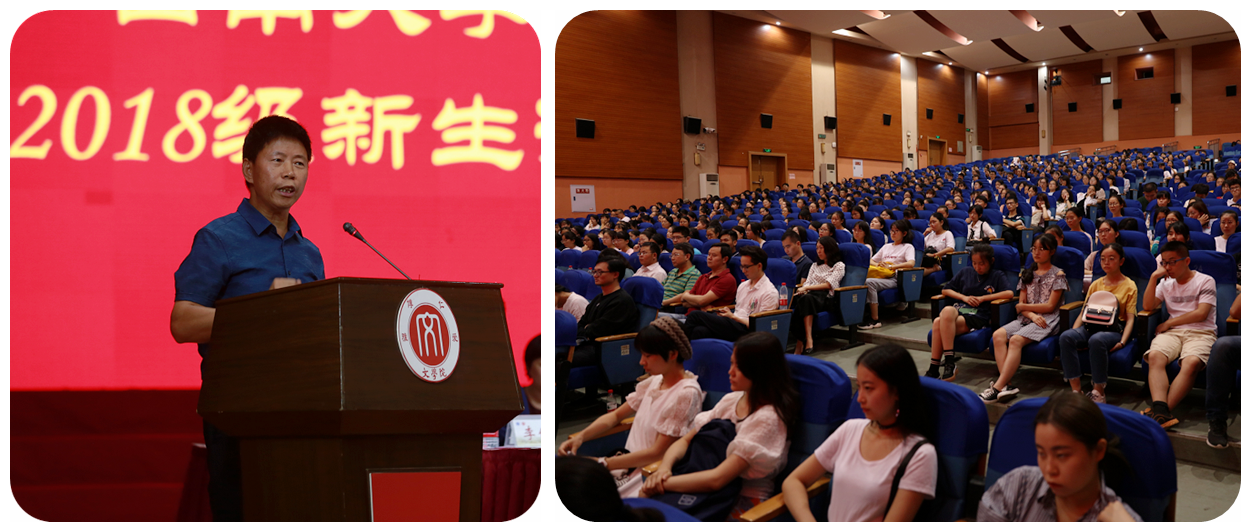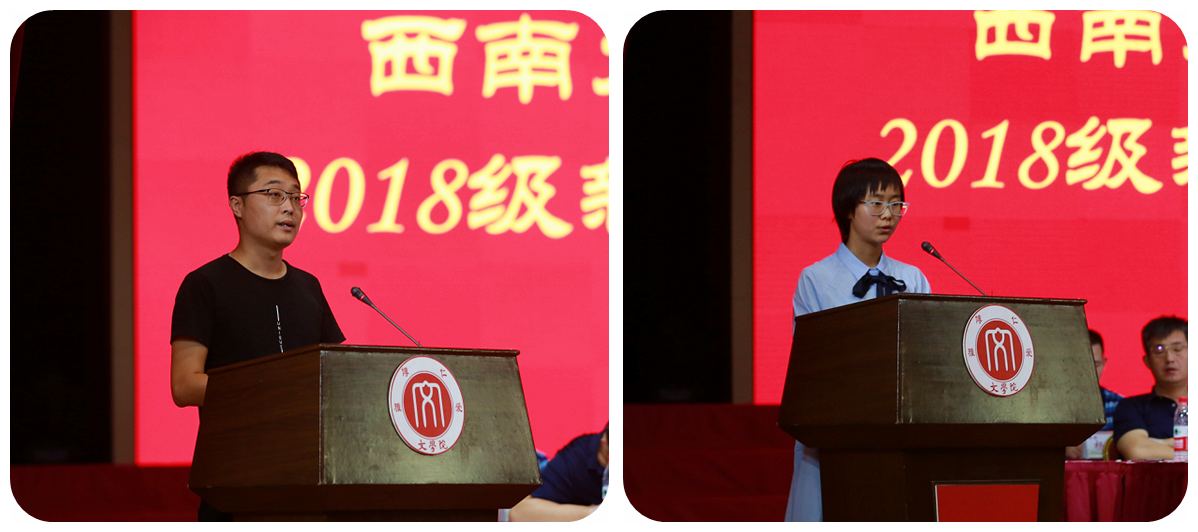 新生代表2018级本科生孙澜僖同学在典礼上发言,孙澜僖同学倡导大家把握机遇,珍惜时光;继承优秀的文学传统,探寻更为深奥的文学境界,以崭新的面貌和振奋的精神迎接新的挑战。