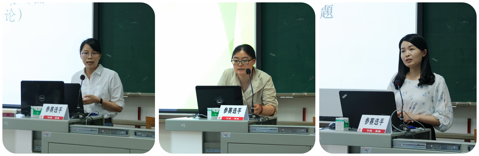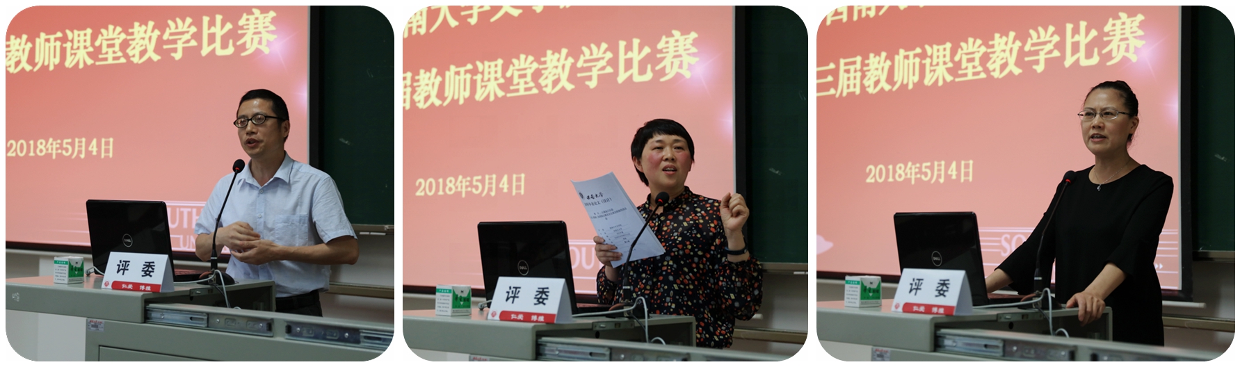 根据参赛规则,讲课顺序由现场抽签产生,所有参赛教师根据本学期教学内容准备赛课内容(15~20分钟以内)。评审专家从教学内容、教学组织、教学语言与教态、教学特色4个方面进行考评,最后择优推荐参加西南大学教师课堂教学决赛。赛课期间,老师们从容不迫的台风、生动形象的肢体语言、独具个性的教学风格,不仅赢得了嘉宾评委的认可与赞扬,更获得了现场同学们的连连喝彩。