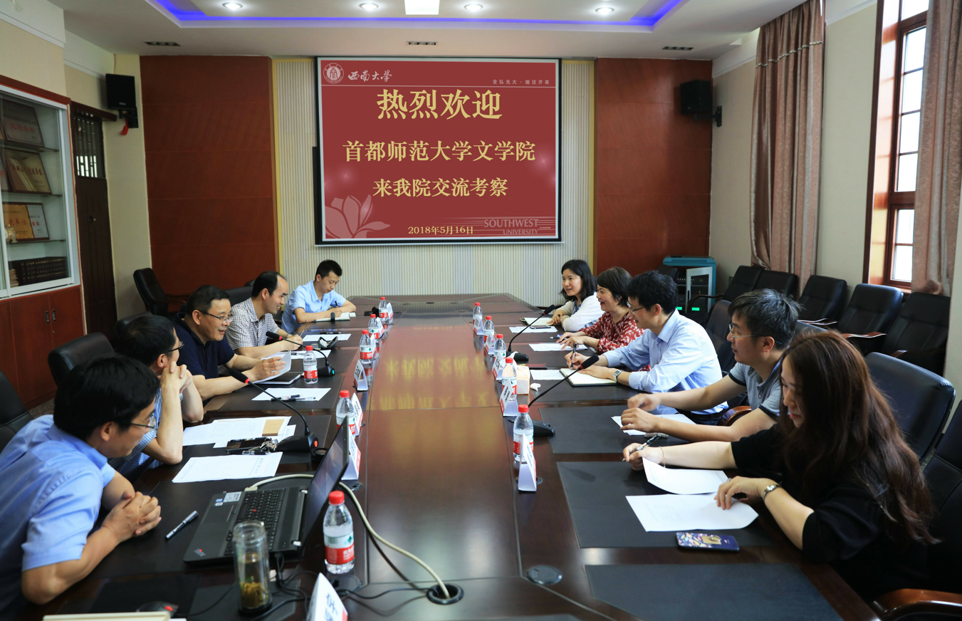 会上,王本朝院长代表学院向首都师范大学best365英国在线体育官网孙士聪副院长一行的到来表示热烈欢迎,并详细介绍了西南大学best365英国在线体育官网的发展状况。王本朝院长表示,希望双方巩固现有合作成果,深化务实合作,在人才培养、学科建设、专业发展等相关领域加强协调配合,推动两院合作交流达到新水平。肖伟胜副院长就学院研究生教学管理、研究生毕业论文质量提升等方面做了简要介绍。何定龙副书记、张春泉副院长围绕大学生思想政治教育管理、学生工作创新开展、本科生教学运行管理、汉语言文学师范专业建设等方面做了相应的介绍。