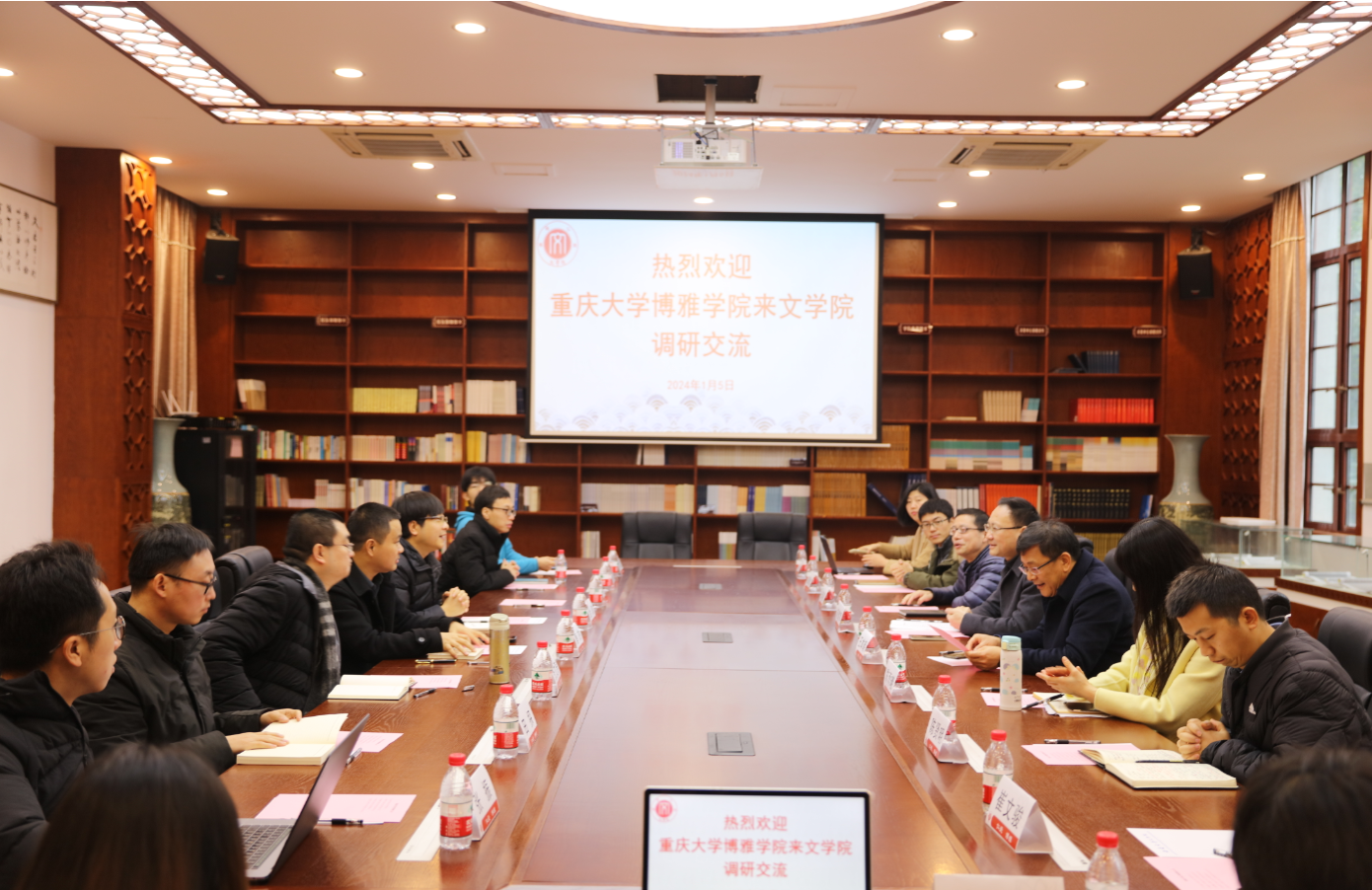 1月5日,重庆大学博雅学院副院长唐杰、中文系主任金浪、哲学系主任张文涛、史学系主任董涛等12人来best365英国在线体育官网就本科365英国在线体育审核评估工作进行调研交流。best365英国在线体育官网院长王本朝、党委书记胡建军、党委副书记陈雨曦、副院长张春泉、教学办公室主任陈贤明参加座谈交流,会议由张春泉副院长主持。