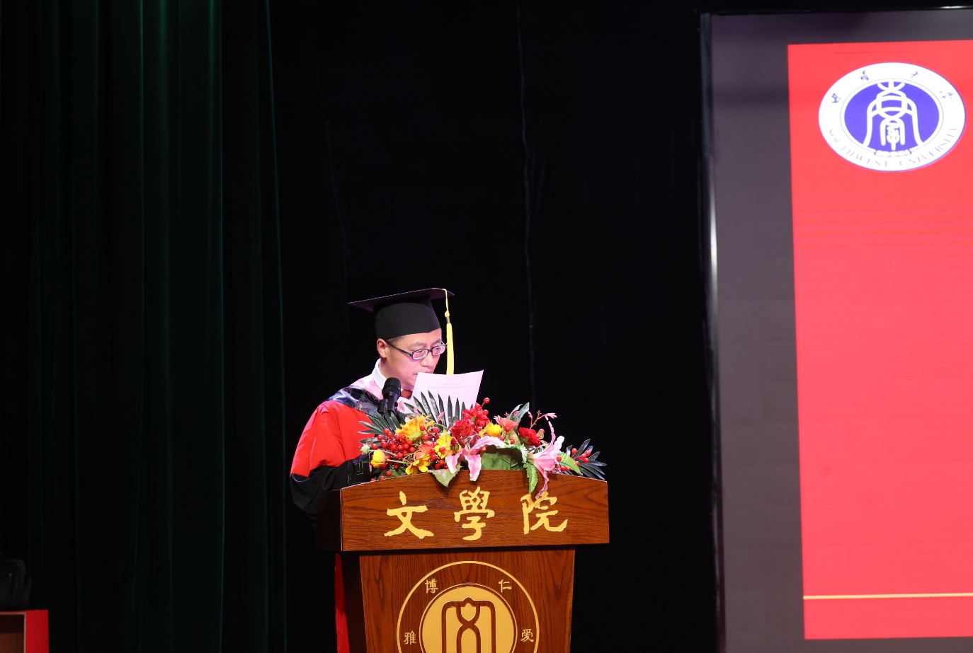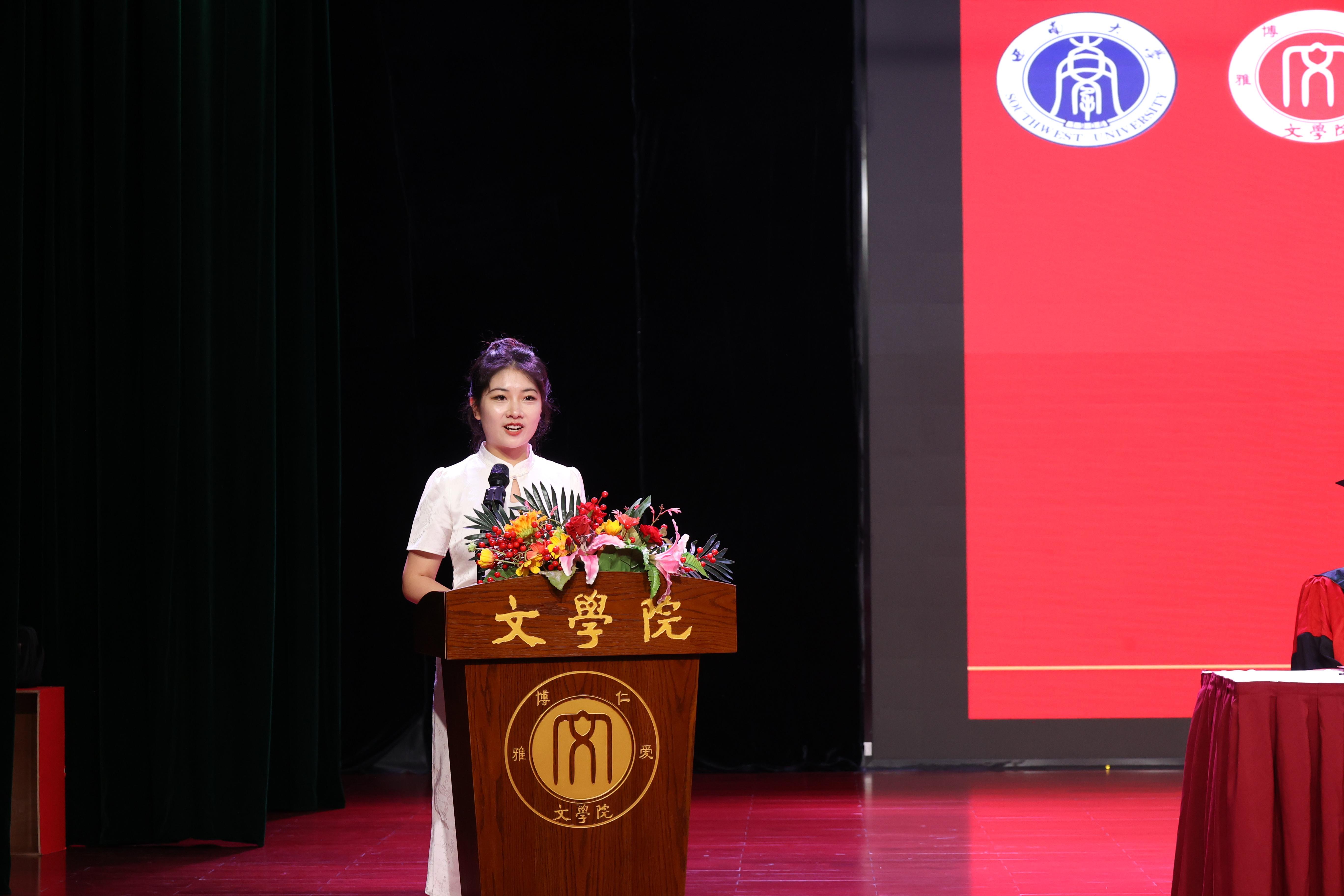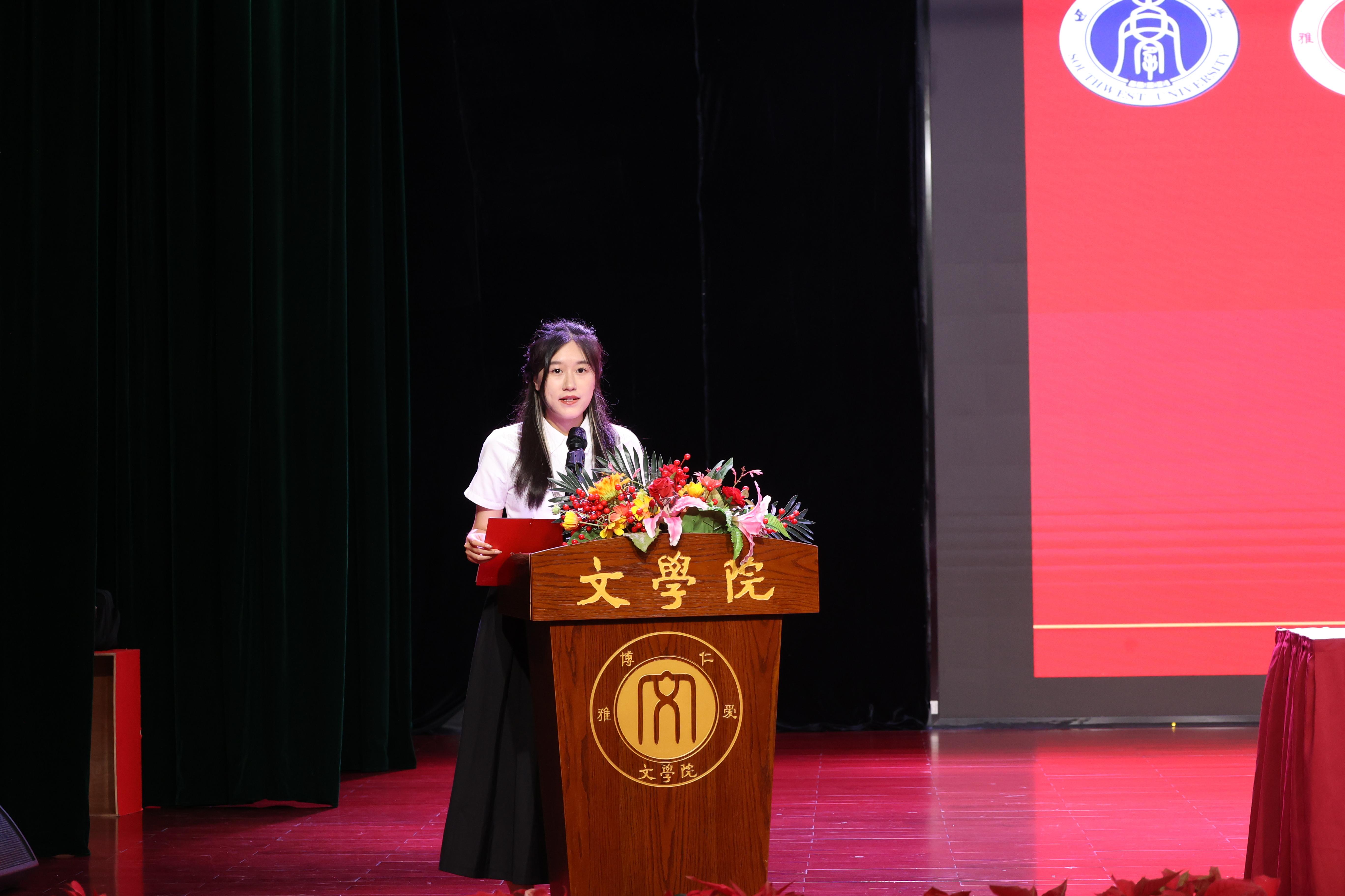 2021级现当代文学专业硕士研究生马潇潇、2020级汉语言文学(师范)专业本科生张琳婧先后发言。马潇潇回顾七年求学生涯,分享自己的收获与成长,希望同学们铭记校训,共谱青春篇章,再续天生之约。张琳婧从文学的“无用之用”出发,分享了自己四年来的感悟与思考,并祝愿同学们从雨僧楼出发,勇敢直面未来的挑战。