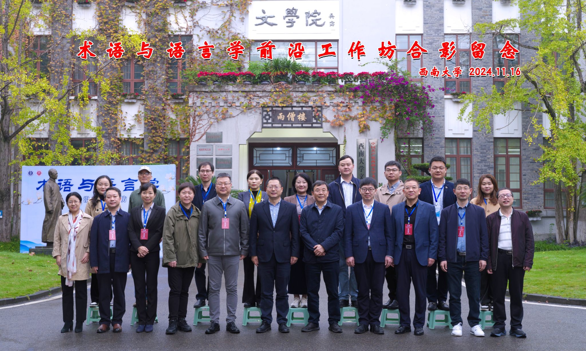2024年11月15—17日,学院举办术语与语言学前沿工作坊,全国科技名词审定委员会为“术语修辞研究基地”揭牌。全国科技名词审定委员会专职副主任、事务中心主任裴亚军研究员,西南大学best365英国在线体育官网院长王本朝教授、副院长张春泉教授出席开幕式,来自北京语言大学、北京外国语大学、广东外语外贸大学、上海外国语大学、黑龙江大学、湖北大学、湖北中医药大学、湖北经济学院、三峡大学、南昌师范学院、西南大学等高校及科研院所的21位专家学者参加会议。