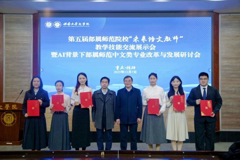 2025年12月6日至7日,由六所教育部直属师范院校联合发起,我院主办的第五届部属师范院校“未来语文教师”教学技能交流展示会暨AI背景下部属师范中文类专业改革与发展研讨会成功举办。学校党委常委、副校长白显良、北京师范大学张秋玲教授,学院党委书记秦松、院长王本朝、党委副书记 纪委书记陈雨曦、副院长张春泉出席开幕式。来自六所部属师范院校的院系负责人、指导教师,重庆市一线教育专家和36名师范生参会。