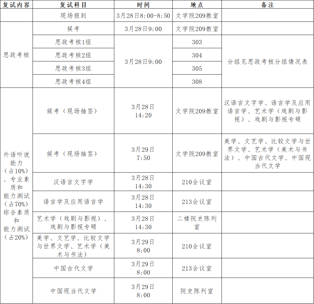 复试工作均在best365英国在线体育官网(雨僧楼)进行,3月28日8:00-8:50在best365英国在线体育官网209教室分组报到并候考参加思政考核,3月28日-29日分专业到best365英国在线体育官网209教室候考参加外语、专业、综合素质面试考核。