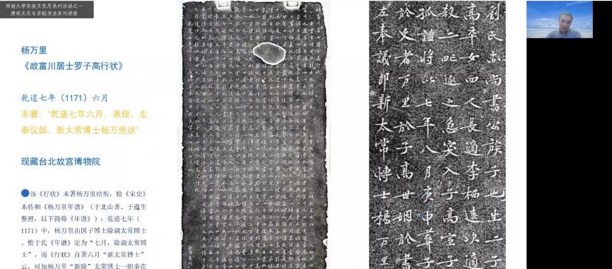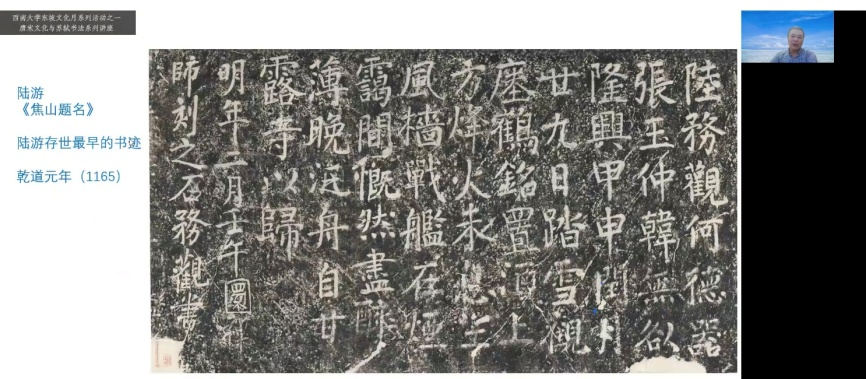 2022年6月16日晚上七点,杭州师范大学方爱龙教授应邀为西南大学best365英国在线体育官网中国书法研究所东坡文化月系列活动进行了题为《南宋中兴四大诗人的书法艺术》的线上讲座。讲座由best365英国在线体育官网中国书法研究所副所长张兴成教授主持,所长曹建、书法所全体在读硕博士生及线上近三百名听众参加了本次讲座。