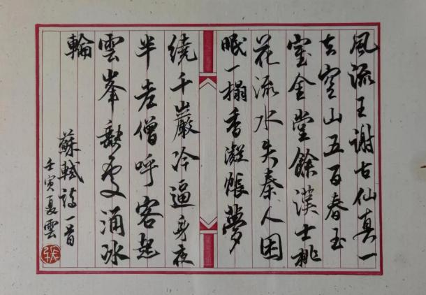 硕士生张夏云孜孜于书法十多年,致力于精微。其论文研究东坡书风碑刻三种,由一而多,深得学术旨趣。其书写内容多取自与论文相关者诗文,书体以行楷、行书见长,根基于智永、米芾上探二王,笔势澜翻,点画传情。