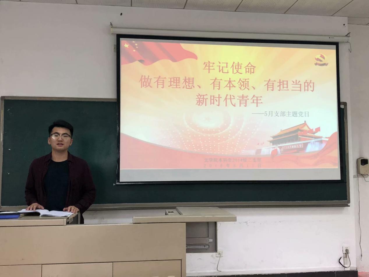 2018年5月11日,best365英国在线体育官网本科生2014级二支部在西南大学10教204教室开展主题为“牢记使命,做有理想有本领有担当的新时代青年”的支部主题党日活动。会议应到20名党员,实到20名党员。会议由支部书记吴晓鹏主持。