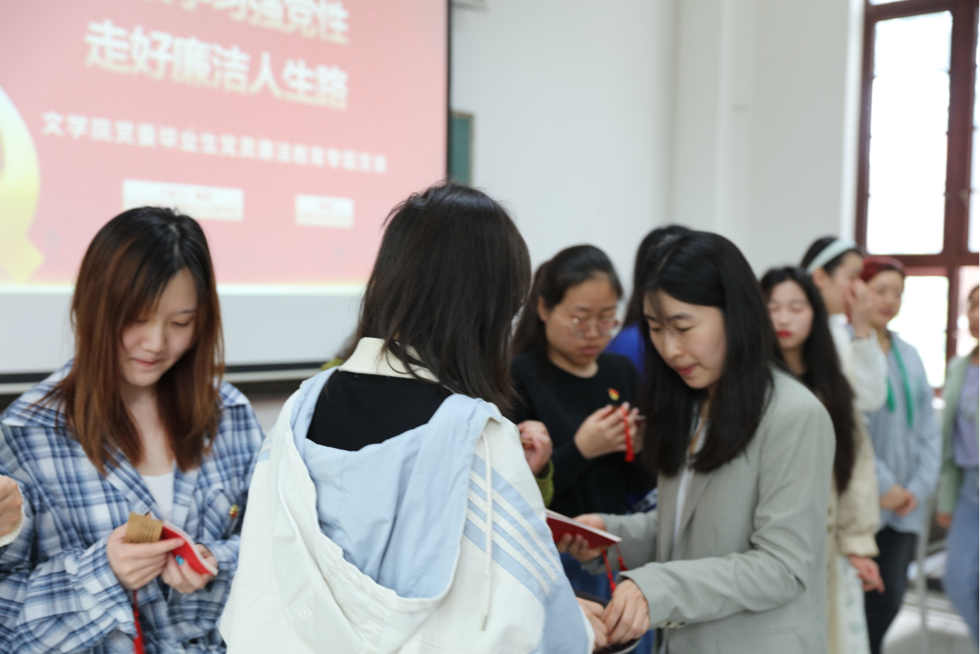 最后,陈玥副书记为全体毕业生党员颁发廉洁教育主题书签和党章。